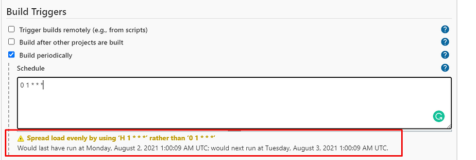 c. In the Build Triggers, we can then paste the same value. But Jenkins gives us a warning. It says to use H instead of 0. This is just because if there are several jobs running at midnight at 1 am, Jenkins knows the priority and runs them accordingly. So. we can replace 0 by H here for now. It also tells us when will the job be run next.