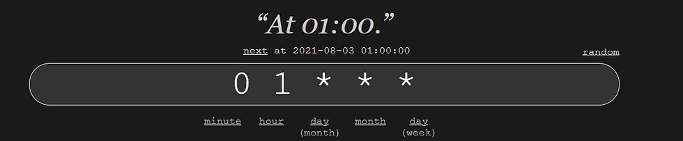 b. We go to the Build Trigger section and click on "Build Periodically". Suppose I want this job to be running at every midnight at 1 a.m every day. For the cron expression, you can simply visit this website. I have selected for 1 a.m for which the cron expression looks like below. This means that every day of the month, every week at 1 hr and 0 min, this job will be triggered. You can change it to 2, 3, 6:30 whatever you want.